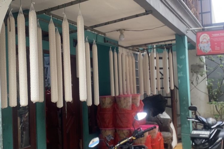 Tempe berbungkus plastik bening digantungkan di langit-langit atap teras rumah warga.